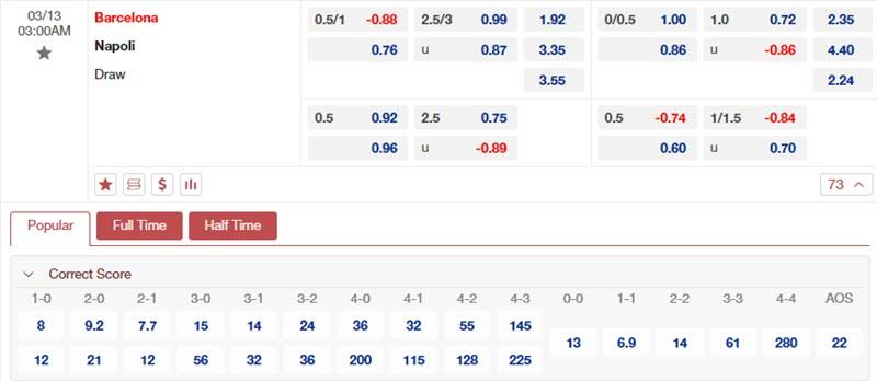 Bảng tỷ lệ kèo Barcelona vs Napoli 3h00 ngày 13/03/2024
