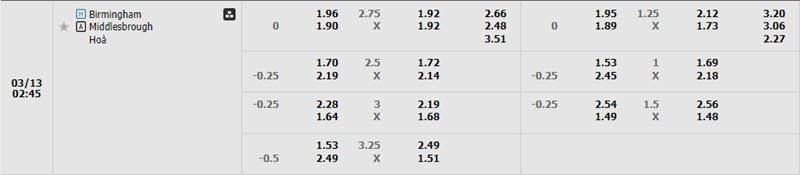 Bảng tỷ lệ kèo Birmingham vs Middlesbrough 2h45 ngày 13/03/2024