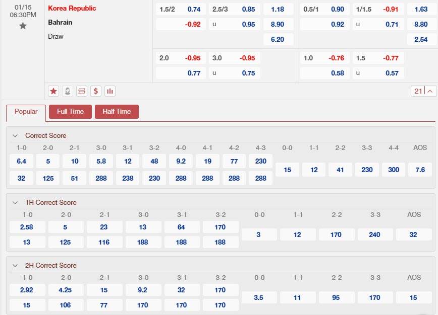 Bảng tỷ lệ kèo Hàn Quốc vs Bahrain 18h30 ngày 15/1/2024