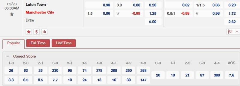 Bảng tỷ lệ kèo Luton vs Man City 3h00 ngày 28/2/2024