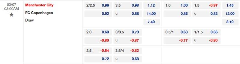 Bảng tỷ lệ kèo Man City vs Kobenhavn 3h00 ngày 07/03/2024