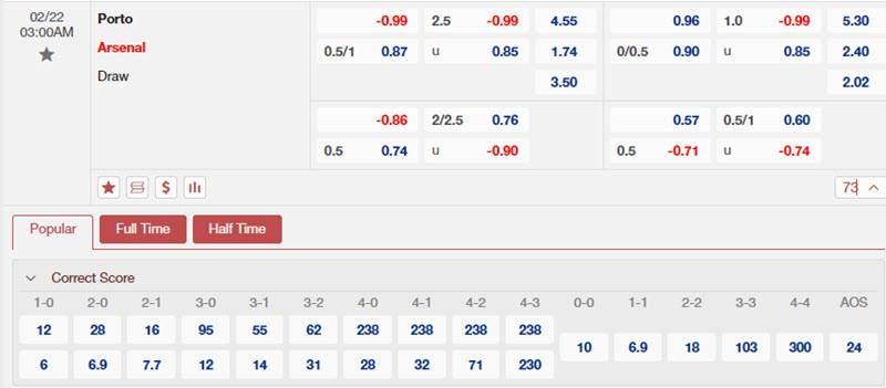 Bảng tỷ lệ kèo Porto vs Arsenal 3h00 ngày 22/2/2024